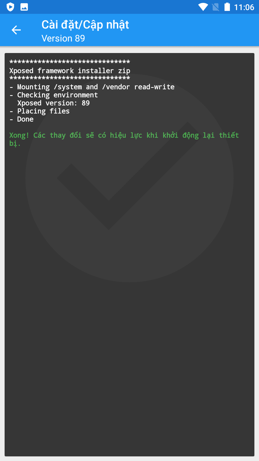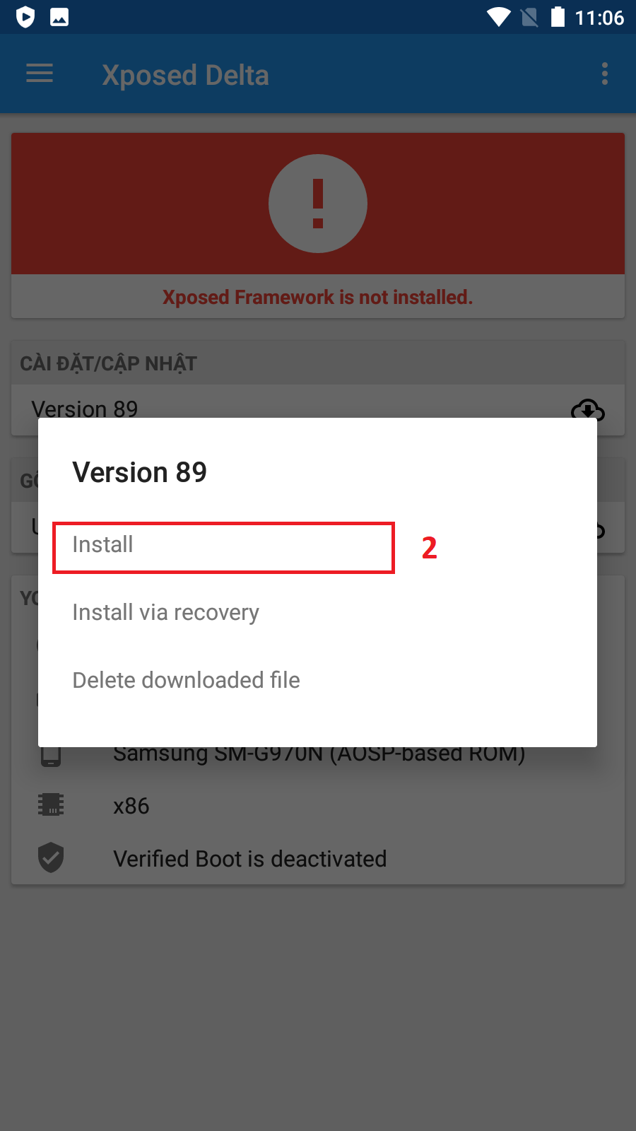 * Mở Xposed Delta => Cài đặt/cập nhật <img src="https://3187809732-files.gitbook.io/~/files/v0/b/gitbook-x-prod.appspot.com/o/spaces%2F1rLVTzpgfNKJ2lDU3kjR%2Fuploads%2FWz4gVCD1gtmkyRojnwU4%2Fimage.png?alt=media&#x26;token=f988fdc8-6c3e-453f-8d68-7fc5e6116c62" alt="" data-size="line"> => Install => chờ Reboot