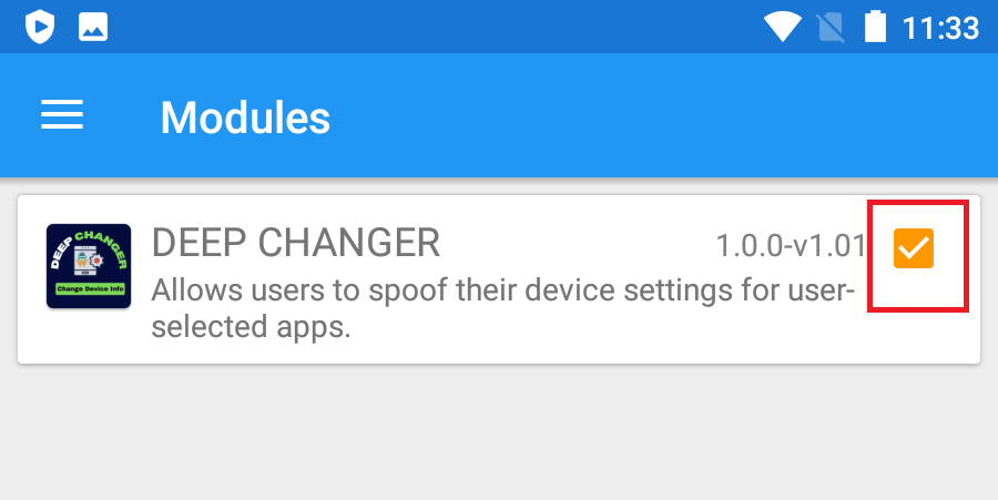 <mark style="color:green;">**6- Mở XPosed**</mark> => vào **Modudes** => check bật đăng ký cho DeepChanger => Khởi động lại thiết bị